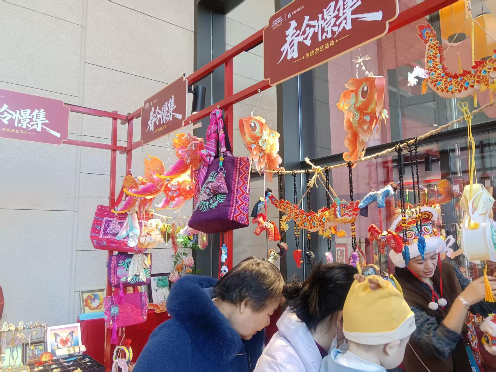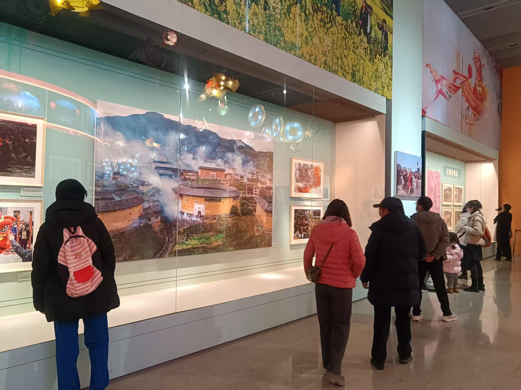 一位摊主给祖孙三代讲解虎头灯笼的文化内涵和制作过程 拾级而上,来到“过年——春节主题摄影展”。2024年,“春节——中国人庆祝传统新年的社会实践”被列为联合国教科文组织人类非物质文化遗产代表作名录,标志着春节得到了国际社会的高度认可。春节承载的和平、和睦、和谐理念,成为促进文明交流互鉴、构建人类命运共同体的重要文化纽带。作为活态传承的非物质文化遗产,春节彰显着独特的文化魅力。这个摄影展览涵盖了各地、各民族丰富的春节非遗项目与习俗,从熬腊八粥到点亮元宵灯,从北方的热闹社火到江南的婉转社戏,全方位、多层次地展现了春节的多元面貌与包容特性。一位工作人员介绍说:“春节是中国所有节日中最隆重的,展览以‘年俗承韵·春景华光’为序,整个布置和色调充满了欢乐祥和的氛围,记录了中国及世界各地春节活动的场景。”这次展览把传统文化与创意布置完美结合起来,体现了我国广袤土地上丰富多彩的年文化形态。来自广东的旅客告诉记者:“这次带孩子专门来体验北方的年味,和我们广东那边不太一样,非常有意思。”一位北京的市民告诉记者:“咱们国家的年文化真的太丰富了,这次展览让我了解了各地过年的不同文化。明年准备去南方现场体验一下‘打油茶’,听听侗族琵琶歌。”