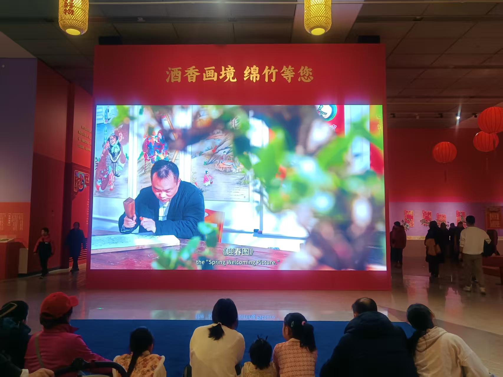 人们驻足观赏春节主题摄影展的作品 关于春节的非遗展览令人应接不暇。年画是春节的重要标志之一,承载着人们对美好生活的期冀。“迎春——绵竹年画中的年俗与新韵”主题展梳理了年画与春节习俗的内在联系,吸引众多观众前来欣赏。绵竹年画被列入首批国家级非物质文化遗产名录,既积淀着深厚的历史文化记忆,也在传承中焕发出历久弥新的生命力。尤为引人注目的是国家一级文物《迎春图》的亮相,这幅被誉为“蜀中《清明上河图》”的清代长卷,全景式再现了立春时节“迎春、报春、游春、打春”的盛大民俗场景,让观众有机会沉浸式感受“年画里的中国年”。展馆用大屏幕播放精彩的纪录片,引导观众领略绵竹年画的源流演变、艺术特质与文化内涵,感知其在历史长河中的传承与发展。