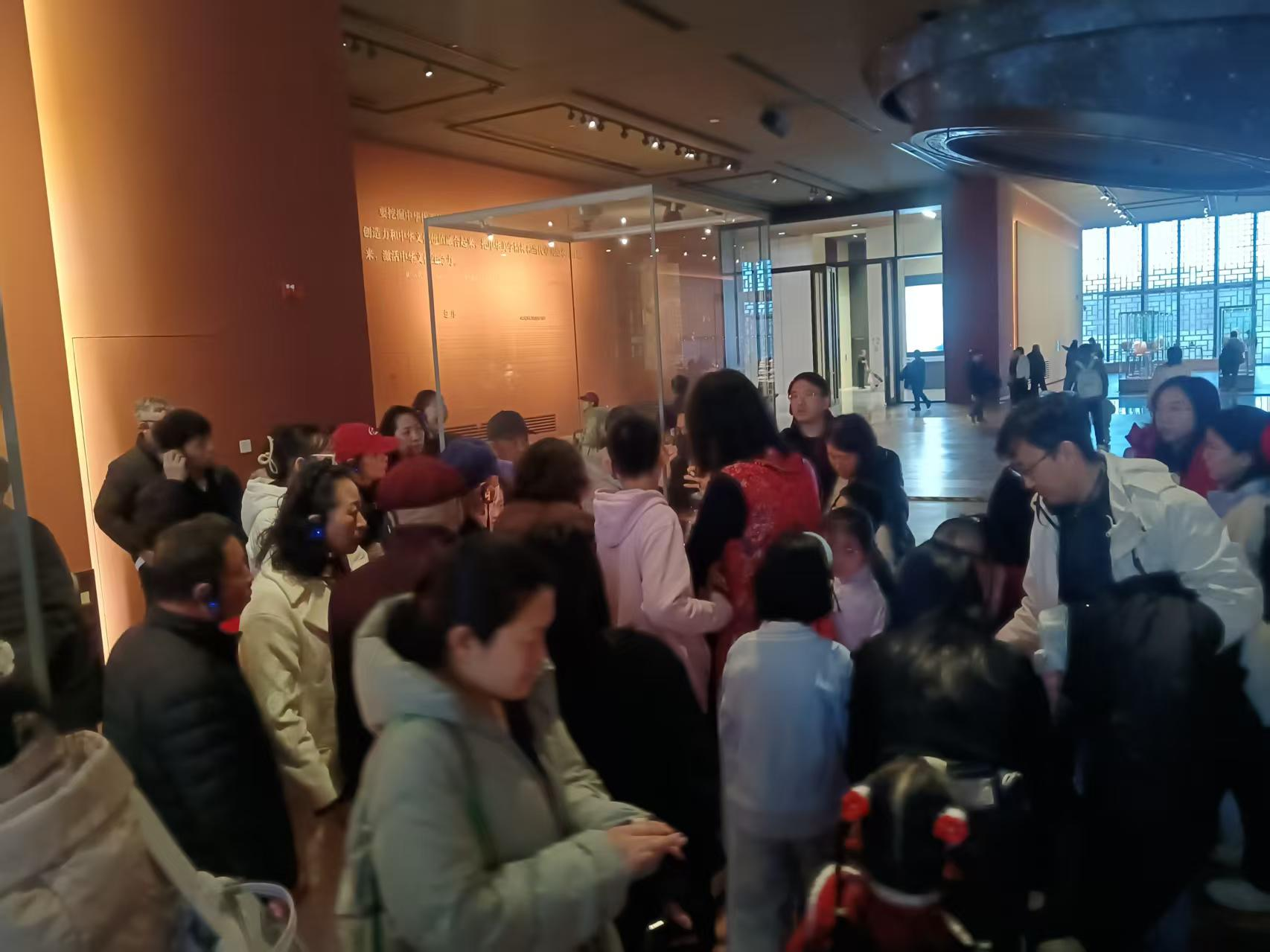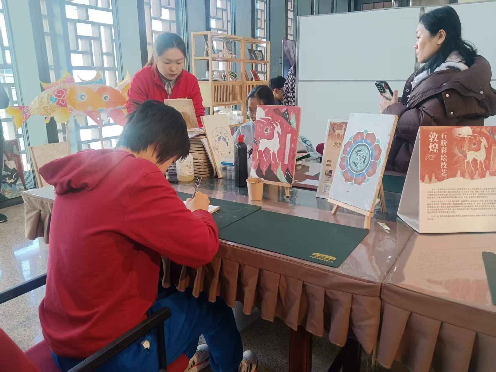 非遗老师耐心地给体验者讲解敦煌石粉彩绘技艺 不知不觉,一天的时间就在馆中过去了。一位工作人员介绍说:“大家对非遗文化非常热爱。初一到初七的门票已经预约完了,想来的观众只能预约后面的门票。为了满足大家的需求,我们展馆正月初一到正月初七都延时开放,比平时延长两个小时闭馆。”有不少来自外地的游客,春节假期第一站就来到了非遗馆,体验非遗文化。他们告诉记者:“来之前,就在网上看到很多宣传中国非物质文化遗产馆的视频,全国各地的非遗文化都汇聚到这里,值得来体验一下。不能只看热闹,想了解这里面的文化,所以专门请了导游给我们讲解。中华文化确实博大精深。”很多走出展馆的观众意犹未尽,纷纷表示还有很多地方没有看到,还想再来。
